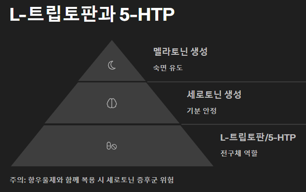 - 효능: 트립토판은 수면 호르몬인 멜라토닌과 행복 호르몬인 세로토닌의 전구체(몸에서 특정 물질로 변환되는 물질)입니다. 트립토판을 섭취하면 세로토닌과 멜라토닌 생성을 촉진하여 숙면을 유도하고 기분을 안정시키는 데 도움을 줄 수 있습니다. 5-HTP는 트립토판이 세로토닌으로 전환되는 중간 물질로, 더 빠르게 작용한다고 알려져 있습니다.