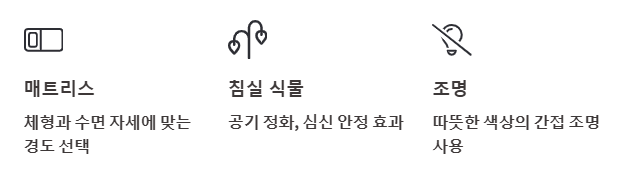 - 전자 기기 사용 금지: 침실에서는 스마트폰, 태블릿, 노트북 사용을 자제하세요.