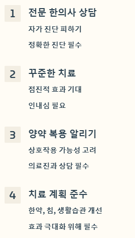 - 치료 계획 준수: 한약 복용, 침 치료, 생활 습관 개선 등 한의사가 제시하는 치료 계획을 성실히 따르는 것이 치료 효과를 높이는 데 필수적입니다.