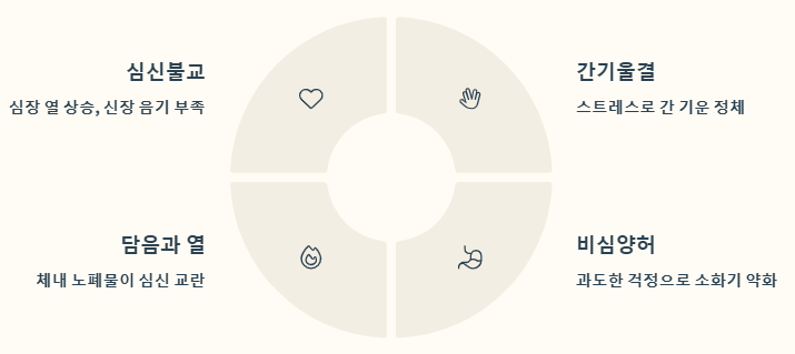 - 심장과 신장의 불균형 (心腎不交): 심장의 열이 위로 오르고 신장의 음기가 부족하여 아래로 내려가지 못해 몸 전체의 음양 균형이 깨진 상태입니다. 가슴이 답답하고 불안하며 잠들기 어려운 증상을 동반합니다.
