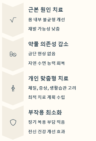 - 근본적인 원인 치료: 단순히 증상만을 억제하는 것이 아니라, 불면증을 유발하는 몸 내부의 불균형을 개선하여 재발 가능성을 낮춥니다.