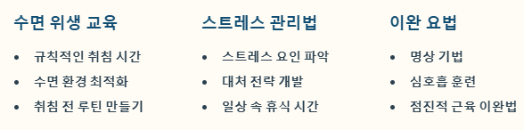 수면 위생 교육, 스트레스 관리법, 이완 요법(명상, 호흡법) 등 불면증 개선을 위한 생활 습관 교정 및 심리 상담을 병행하여 치료 효과를 높입니다.