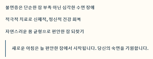 - 전신 건강 개선: 불면증 치료와 함께 소화 불량, 피로감, 불안감, 두통 등 동반된 다른 증상들까지 개선되는 전신 건강 증진 효과를 기대할 수 있습니다.