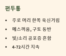 - 주기적으로 재발하는 두통: 편두통은 간헐적으로 발생하며, 통증이 나타나면 최소 4시간에서 길게는 72시간까지 지속될 수 있습니다.