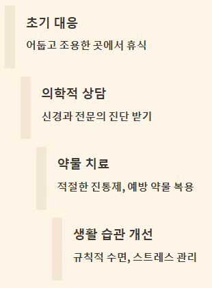 👉 편두통이 심할 때는 진통제가 효과적인 완화 방법이 될 수 있지만, 무조건 먹어야 하는 것은 아닙니다. 진통제 오남용은 오히려 약물 과용 두통을 유발할 수 있습니다. 초기 증상 시 바로 휴식을 취하거나, 어둡고 조용한 곳에서 안정을 취하는 등 비약물적인 방법으로 대처해 보고, 통증이 심해질 때 전문가의 처방을 받은 약물을 복용하는 것이 좋습니다.