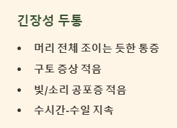 - 찌릿찌릿, 욱신거리는 통증: 머리가 맥박에 맞춰 욱신거리고 쿵쾅거리는 듯한 통증이 나타납니다.