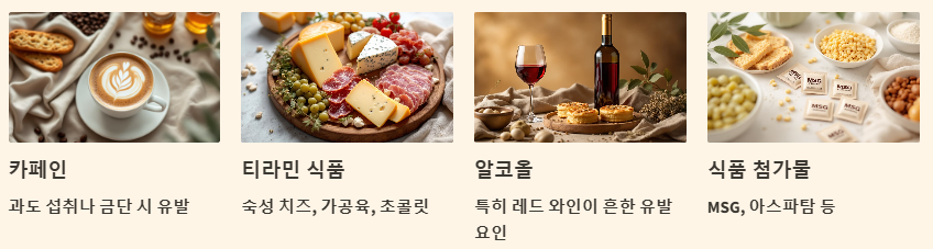 - 카페인: 과도한 카페인 섭취나 갑작스러운 카페인 금단이 편두통을 유발할 수 있습니다.