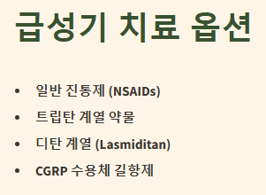 - 디탄 계열 (Lasmiditan): 트립탄 계열과 유사하지만 혈관 수축 작용이 없어 심혈관 질환이 있는 환자에게도 사용 가능성을 열어주는 새로운 급성기 치료제입니다.