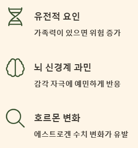 편두통은 단순히 머리가 아픈 증상을 넘어, 뇌의 신경학적 특성과 관련된 질환입니다. 아직 단일 원인이 명확히 밝혀지지는 않았지만, 다음과 같은 복합적인 요인들이 작용하는 것으로 보고 있습니다.