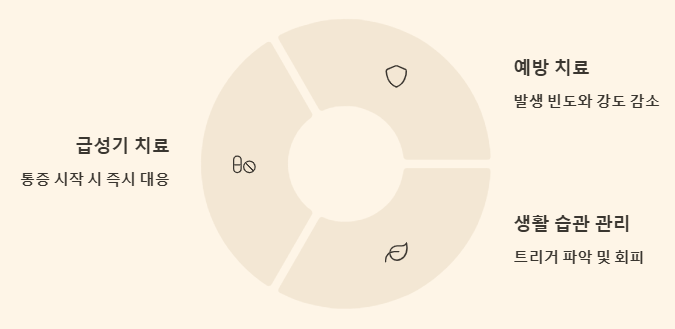 편두통 치료는 크게 급성기 치료(통증 완화)와 예방 치료(발생 빈도 및 강도 감소)로 나뉩니다. 두 가지 모두 중요하며, 환자 개개인의 증상과 상태에 맞춰 맞춤형으로 접근해야 합니다.