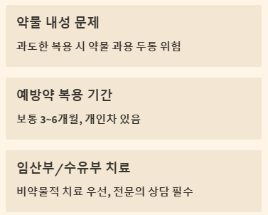 👉 임산부나 수유부는 약물 복용에 매우 신중해야 합니다. 특정 약물은 태아나 영아에게 영향을 미칠 수 있기 때문입니다. 반드시 산부인과 전문의와 신경과 전문의가 협진하여 안전한 범위 내에서 치료 방법을 결정해야 합니다. 비약물적 치료(휴식, 스트레스 관리, 냉찜질 등)를 우선적으로 시도하며, 필요한 경우 안전성이 입증된 약물을 최소 용량으로 사용하는 것을 고려할 수 있습니다.