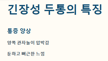 - 통증 양상: 양쪽 관자놀이를 띠로 조이거나 압박하는 듯한 둔한 통증이 느껴집니다. '찌릿찌릿'하기보다는 묵직하거나 뻐근한 느낌이 강합니다.