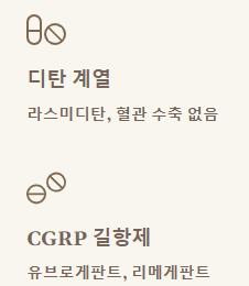 - 작용: 트립탄과 유사하게 세로토닌 수용체에 작용하지만, 혈관 수축 작용은 없어 심혈관 질환이 있는 환자도 사용 가능성이 열렸습니다.