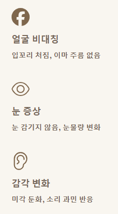 - 얼굴 감각 이상: 마비될 쪽 얼굴이 둔하거나 얼얼한 느낌, 혹은 미세한 저림 증상이 나타날 수 있습니다.