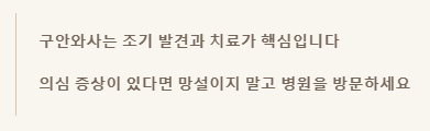 구안와사는 심각한 후유증을 남길 수 있는 질환이지만, 초기 진단과 치료가 빠르면 90% 이상 완치될 수 있습니다. '혹시' 하는 의심이 든다면, 망설이지 말고 병원을 방문하여 '골든타임'을 사수하세요.