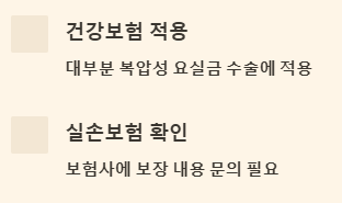 - 개인이 가입한 실손 의료보험이 있다면 수술 비용의 일부 또는 대부분을 보장받을 수 있습니다. 수술 전 반드시 가입된 보험사에 문의하여 보장 내용을 확인하는 것이 중요합니다.