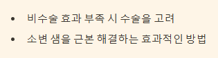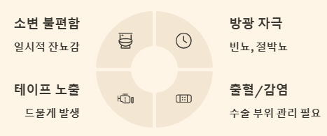 - 수술 직후 일시적으로 소변이 잘 나오지 않거나, 소변을 봐도 시원하지 않은 잔뇨감이 느껴질 수 있습니다. 대부분 시간이 지나면서 자연스럽게 호전됩니다.