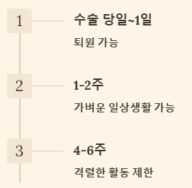 - 수술 후 큰 불편함이 없다면 1~2주 이내에 대부분의 일상생활 복귀가 가능합니다.