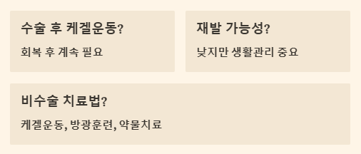 - 수술 후 회복 기간이 지난 후에는 케겔운동을 다시 시작하고 꾸준히 실천해야 합니다. 이는 수술 효과를 극대화하고 재발을 방지하는 데 큰 도움이 됩니다.
