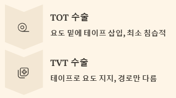 - 원리: TOT 수술과 유사하게 테이프를 이용하여 요도를 지지하지만, 테이프가 통과하는 경로가 다릅니다. 이 역시 요도와 방광을 제자리로 고정해 소변이 새는 것을 막습니다.