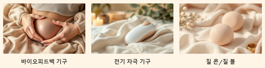 - 전기 자극 기구: 저주파 전류를 이용하여 골반저근을 자동으로 수축시켜 근육을 강화합니다. 스스로 근육을 조절하기 어려운 경우나 빠른 근력 강화를 원할 때 도움이 될 수 있습니다.