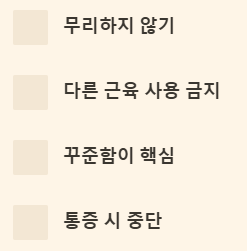 - 통증 시 중단: 운동 중 통증이 느껴진다면 즉시 중단하고 전문가와 상담하세요.