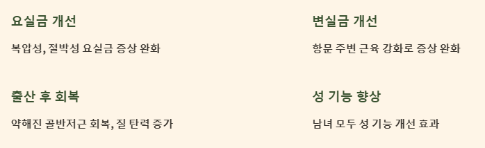 - 출산으로 약해진 골반저근의 회복을 돕고, 질의 탄력을 증가시켜 성 기능 향상에도 긍정적인 영향을 줍니다.