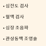 - 혈액 검사: 심장 효소 수치를 측정하여 심근 손상 여부를 확인하거나, 콜레스테롤, 혈당 수치 등을 확인합니다.