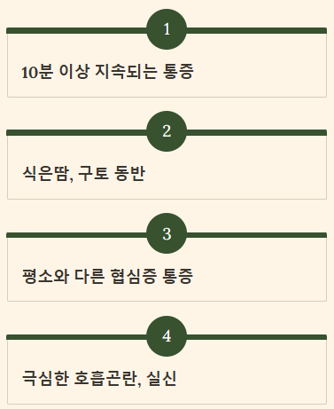 - 가슴 통증이 10분 이상 지속되거나, 휴식을 취해도 호전되지 않을 때