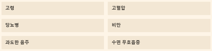 👉 고령, 고혈압, 당뇨병, 심부전, 비만, 과도한 음주, 수면 무호흡증, 갑상선 기능 항진증 등 다양한 원인이 복합적으로 작용하여 발생할 수 있습니다.