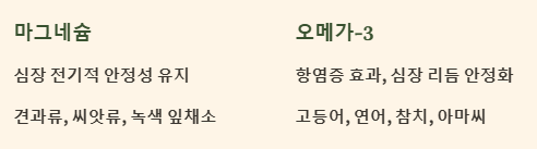 - 역할: 오메가-3 지방산은 강력한 항염증 효과가 있어 심혈관 질환 위험을 낮추고, 심장 리듬 안정화에 도움을 줄 수 있다고 알려져 있습니다.