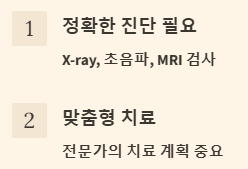 👉 급성 통증이라면 냉찜질로 염증과 붓기를 줄이고, 휴식을 취하는 것이 도움이 됩니다. 만성적인 통증이라면 온찜질로 근육을 이완시켜 줄 수 있어요. 하지만 통증이 심하거나 지속된다면 자가 처치보다는 반드시 병원을 방문해야 합니다.