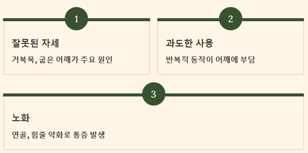 - 나이가 들면서 어깨 관절을 구성하는 연골, 힘줄, 인대 등이 점차 약해지고 마모되면서 통증이 발생할 수 있어요.