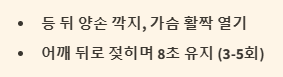 - 효과: 굽은 어깨와 좁아진 가슴을 펴주고, 어깨 앞쪽 근육의 긴장을 풀어줍니다.