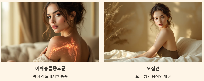 👉 어깨 충돌증후군은 특정 각도(60~120도)에서 팔을 들어 올릴 때 힘줄이 뼈에 끼어 통증이 발생하는 것이 특징입니다. 반면 오십견은 어깨 관절 전체가 굳어 모든 방향으로의 움직임에 제한이 오고 통증이 동반되는 질환입니다.