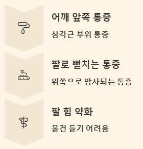 - 팔을 완전히 들어 올리는 동작이 어렵거나, 억지로 들면 통증이 심해집니다.