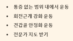 통증이 없는 범위 내에서 어깨 주변 근육을 강화하는 운동을 꾸준히 합니다. 회전근개 강화 운동, 견갑골 안정화 운동 등이 도움이 됩니다. 하지만 통증이 있을 때는 무리한 운동은 피하고, 전문가의 지도를 받아 안전하게 운동하는 것이 중요합니다.