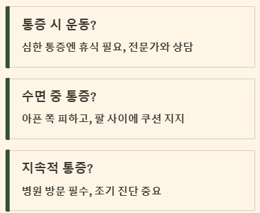 👉 아픈 어깨 쪽으로 눕는 것을 피하고, 똑바로 눕거나 반대쪽으로 눕는 것이 좋습니다. 옆으로 누울 때는 팔 사이에 작은 베개나 쿠션을 끼워 어깨가 아래로 꺾이지 않도록 지지해 주는 것도 도움이 됩니다.