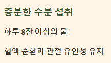 물은 우리 몸의 혈액 순환을 돕고 근육과 관절의 유연성을 유지하는 데 필수적입니다. 하루 8잔 이상의 물을 충분히 마시는 습관을 들이세요.