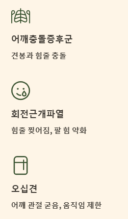 | 어깨 통증은 모두 오십견이다? | 아닙니다. 오십견은 어깨 통증의 여러 원인 중 하나일 뿐입니다. 회전근개파열, 충돌증후군, 석회성 건염 등 다양한 질환이 어깨 통증을 유발하므로 정확한 진단이 필요합니다. |