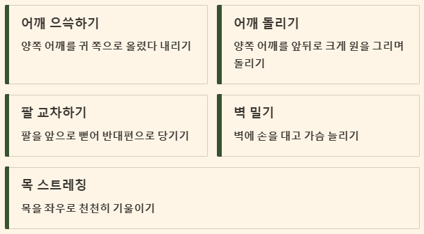 - 가벼운 스트레칭: 어깨 으쓱하기, 어깨 돌리기, 목 좌우로 기울이기 등 간단한 스트레칭을 하루 2~3회, 각 동작 10초 이상 꾸준히 합니다.