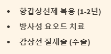 - 항갑상선제 복용: 갑상선 호르몬 생성을 억제하는 약물을 복용하여 호르몬 수치를 정상화합니다. 증상이 호전되어도 재발 방지를 위해 꾸준히 복용하고 정기적인 추적 관찰이 중요합니다.