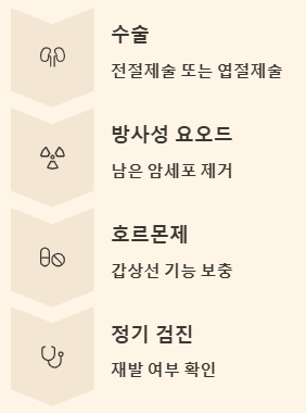 👉 수술 후에는 갑상선 호르몬 부족을 막고 암 재발을 억제하기 위해 갑상선 호르몬제를 꾸준히 복용해야 합니다. 또한, 혈액 검사(갑상선 기능, 갑상선암 표지자)와 갑상선 초음파 검사 등을 통해 정기적으로 재발 여부를 확인하는 것이 중요합니다. 건강한 생활 습관 유지도 회복에 도움이 됩니다.