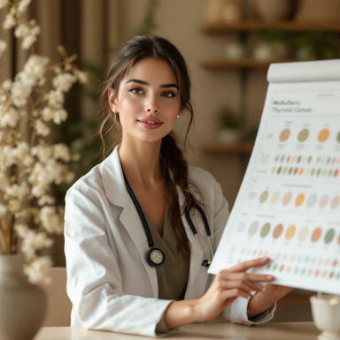 - 특징: 전체 갑상선암의 약 1~2%를 차지하는 비교적 드문 종류입니다. 갑상선 호르몬을 분비하는 세포가 아닌 칼시토닌을 분비하는 C세포에서 발생합니다. 가족력이 있는 유전성 경향(MEN 2 증후군)이 강한 특징이 있습니다. 림프절 및 원격 전이가 유두암이나 여포암보다 흔하며, 예후는 유두암/여포암보다는 좋지 않지만, 다른 고형암에 비하면 비교적 양호합니다.