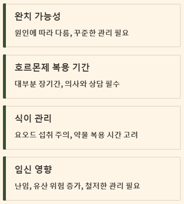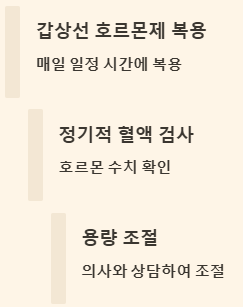 - 정기적인 추적 관찰: 호르몬제 복용 후에도 정기적인 혈액 검사를 통해 호르몬 수치를 확인하고, 용량을 조절하며 갑상선 상태를 지속적으로 관리해야 합니다.
