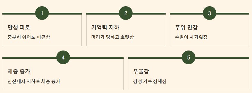 - 만성 피로 및 무기력함: 충분히 쉬어도 피곤함이 가시지 않고, 항상 몸이 축 처지는 느낌이 듭니다. 아침에 잠자리에서 일어나기가 유독 힘들어집니다.