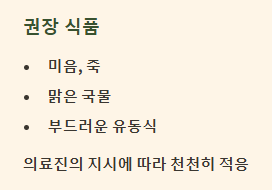 - 수술 후 1~2주 (퇴원 초기): 미음에서 흰쌀밥, 부드러운 반찬으로 넘어가는 시기입니다. 소화가 잘되는 흰살 생선, 두부, 달걀찜, 맑은 채소국 등을 섭취하고, 섬유질이 많은 채소는 익혀서 먹는 것이 좋습니다.