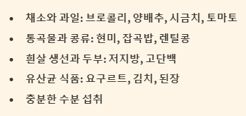 - 통곡물과 콩류: 현미, 잡곡밥, 콩, 렌틸콩 등에는 식이섬유와 비타민B가 풍부하여 장 건강에 도움을 줍니다.