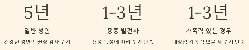 👉 일반적인 건강한 성인은 5년에 한 번 대장내시경 검사를 받는 것이 권장됩니다. 하지만 용종이 발견되었거나, 가족 중에 대장암 환자가 있다면 의사의 소견에 따라 1~3년 주기로 검사 시기가 단축될 수 있습니다.