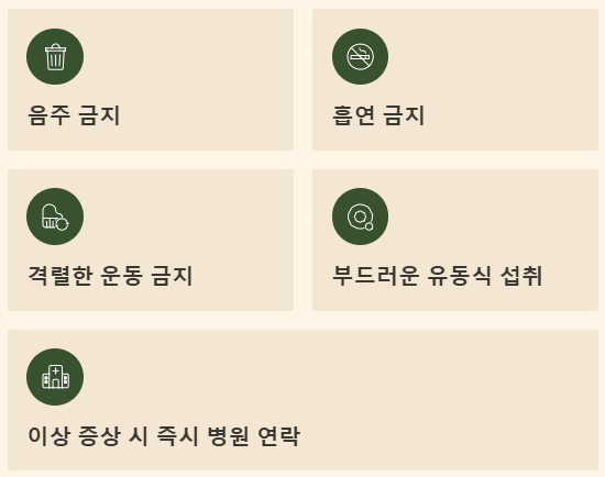 👉 용종 제거 후에는 며칠 동안 음주, 흡연, 격렬한 운동을 피하고, 자극적인 음식보다는 부드러운 유동식 위주로 식사하는 것이 좋습니다. 출혈이나 복통 등의 이상 증상이 있을 경우 즉시 병원에 연락해야 합니다.